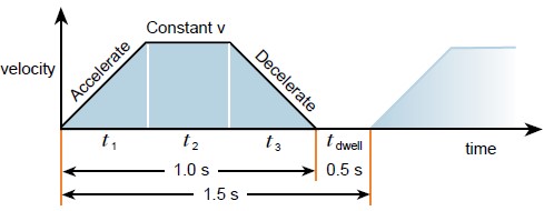 The gearmotor needs to deliver a peak acceleration torque to the lead screw shaft in order to accelerate the mass against gravity to the steady-state lead screw speed of 886 RPM (rounded up to 900 RPM). The gearmotor will then need to supply enough steady-state torque to move the mass against gravity at a constant velocity. During deceleration, the gearmotor will need to supply a negative torque to stop the load in a controlled manner. All this will occur in 1.0s before the motor stops and remains idle for a 0.5s dwell. After resting, the gearmotor will reverse and move along the same motion profile to bring the load back to the starting point.