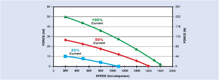 Figure 3. Example of current starving a Hybrid Size 17 Double Stack Linear Actuator (percentages are relative to the continuous-duty rated current.)