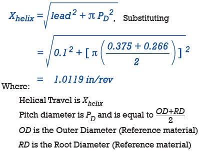 The capabilities of engineered polymers in a leadscrew application are dependent on the application specifications. Let’s say we have an 18.5 lb. load, which we want to move at 2 in/s. To calculate PV of this system we still need the diameter and lead of the lead screw. If we select a 0.375 (3/8) inch diameter by 0.1 inch lead, we can now calculate the PV of the application. Helical Travel tells us the linear distance the nut travels during each revolution,