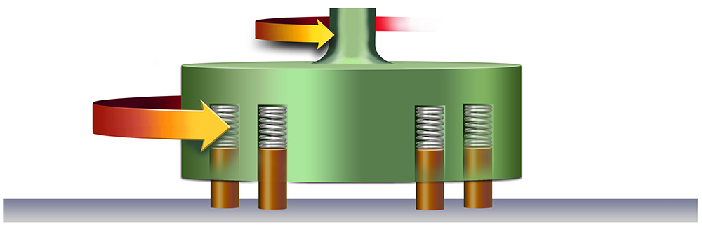 A good standard for testing PV of a material is to take a puck of known diameter, and run it along a static surface (see figure 1). The cut-away figure below shows pucks that are loaded with a spring force to allow for all variables in the PV equation to be known and to verify the manufacturer’s data for a specific material. This can be directly related to the leadscrew equations above if we replace the surface area of the puck with the surface area of the thread (SAthread). This can be used to accurately make assumptions for leadscrew applications because the velocity, surface area, travel distance and load of the pucks are all known.