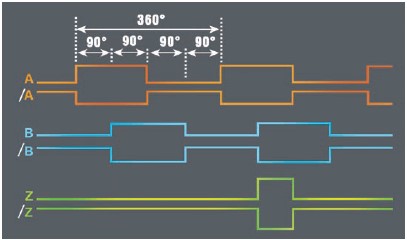 The number of square wave pulses per revolution (known as “Cycles Per Revolution” or CPR) determines the maximum precision available to the control system. Having two channels offset from one another by 90°e (known as quadrature), gives the control software a way to determine the direction of motor rotation. For example, if the A channel leads the B channel the motor rotates clockwise and vice versa. Differential complimentary channels can be used by the control system to filter high frequency electrical noise.