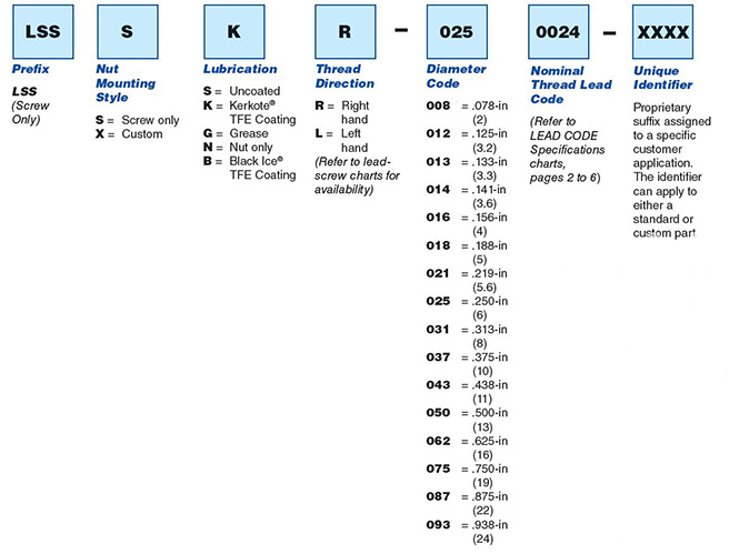 ZBXTKR-043-0250-XXXX = 含义:ZBX系列螺母,螺纹安装,Kerkote® TFE涂层,右旋螺纹,7/16英寸螺杆直径,0.250螺纹导程,无其他特殊要求。